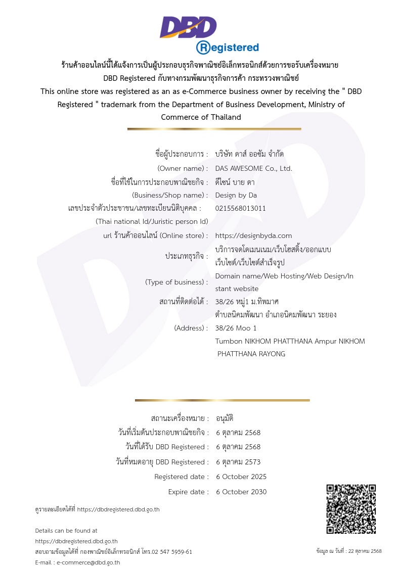 Design by Da - เราคือบริษัทผู้เชี่ยวชาญด้าน รับทำเว็บไซต์ ครบวงจร ไม่ว่าจะเป็น รับทำเว็บไซต์ WordPress, ออกแบบและ ปรับปรุงเว็บไซต์ ให้ทันสมัย ไปจนถึง รับทำเว็บไซต์ E-Commerce ที่ตอบโจทย์การขายออนไลน์ เรามุ่งสร้างเว็บไซต์ที่ใช้งานง่าย สวยงาม และที่สำคัญคือช่วยเพิ่มยอดขายให้ธุรกิจของคุณ